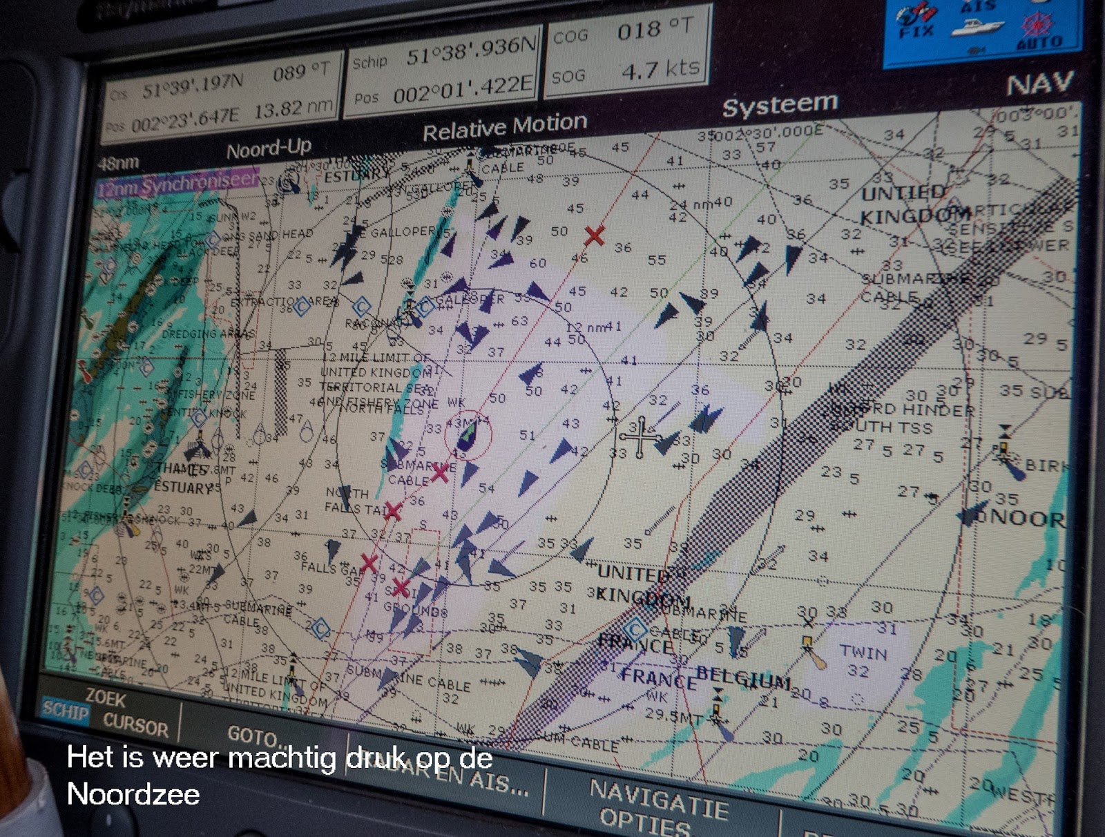 Nog vier etmalen om IJmuiden te bereiken. De weersvoorspelling voor deze dagen klopt maar half. Zoals gewoonlijk is de richting van de wind wel goed, maar de kracht soms minder maar meestal meer. De eerste 3 dagen wat minder en de laatste veel meer dan voorspeld. Na Dover trekt de wind aan tot 8 Bf en bij het aanlopen voor IJmuiden staat er nog steeds een dikke 7 Bf, 35 knopen en aan lager wal. Niet echt fijn. We doen het ermee en zoals altijd sleept SantanA ons er wel doorheen.
